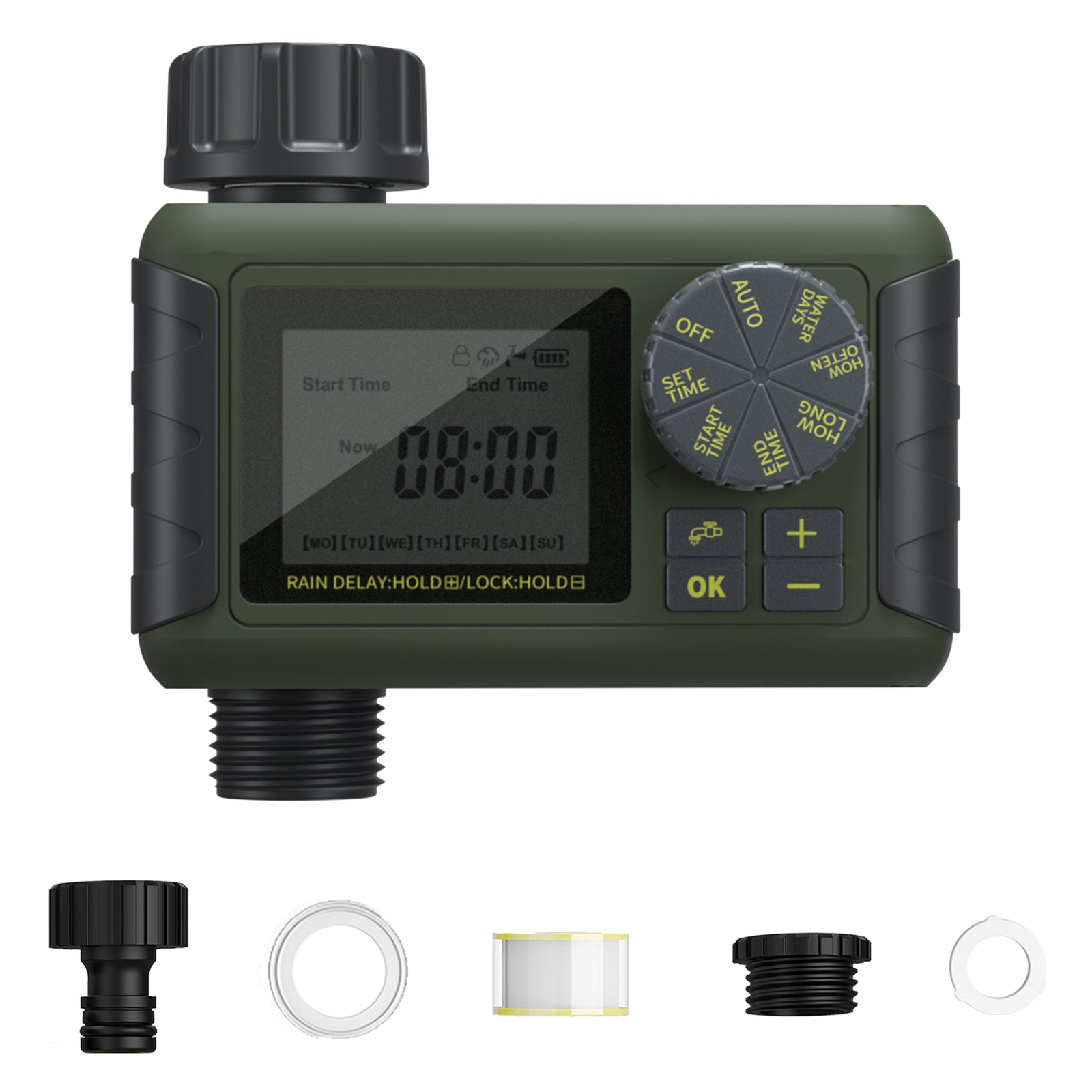 - Upgraded Leak-Proof Design: the connectors of the IPX5 smart water timer can withstand water pressures from 7.25 psi to 116 psi. 2 different sizes sealing washers and thread seal tape to prevent water timer from leakage. Install your timer at standard 3/4" or 1/2" garden outdoor faucet.